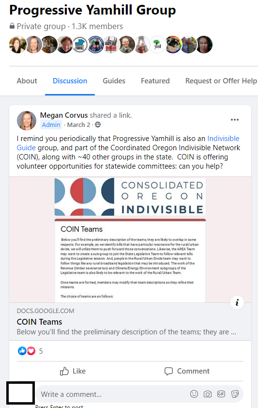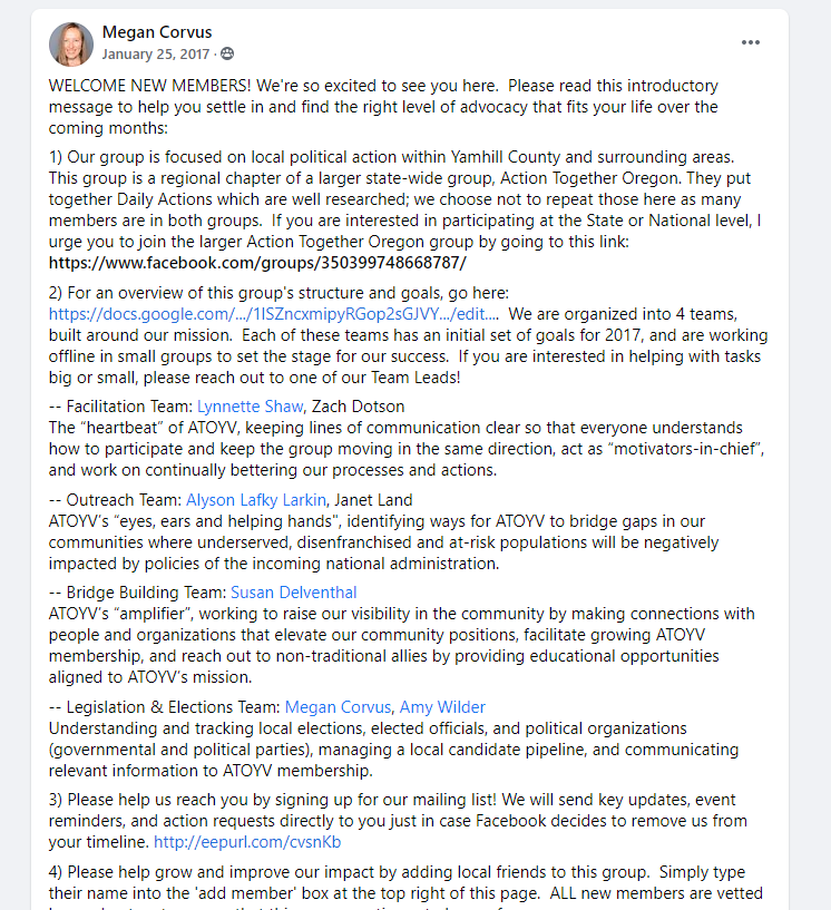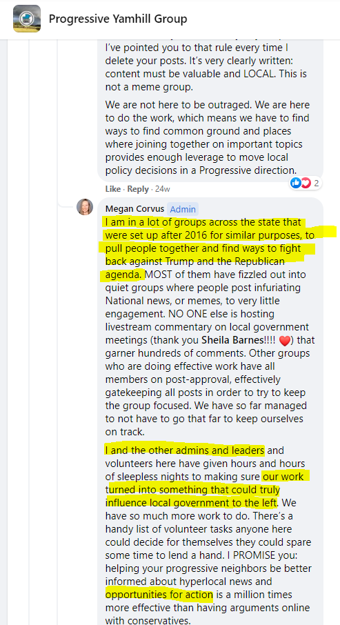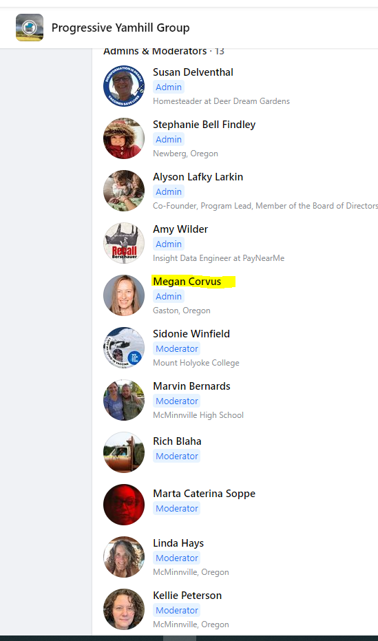 The existence and influence of Progressive Yamhill in the affairs of Yamhill Co. cities and county government, and even state, is undeniable, especially given the individuals involved who are public officials and what activities they engage in within the groups. This is because many of the “calls to action” made within these private splinter groups at city and county level are specific to the election of certain members of the splinter groups themselves, who then use their elected offices to push the agenda of the splinter cells (such as Progressive Yamhill) and the Indivisible organization.