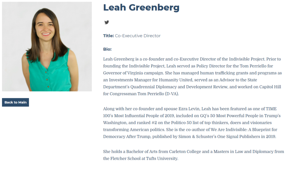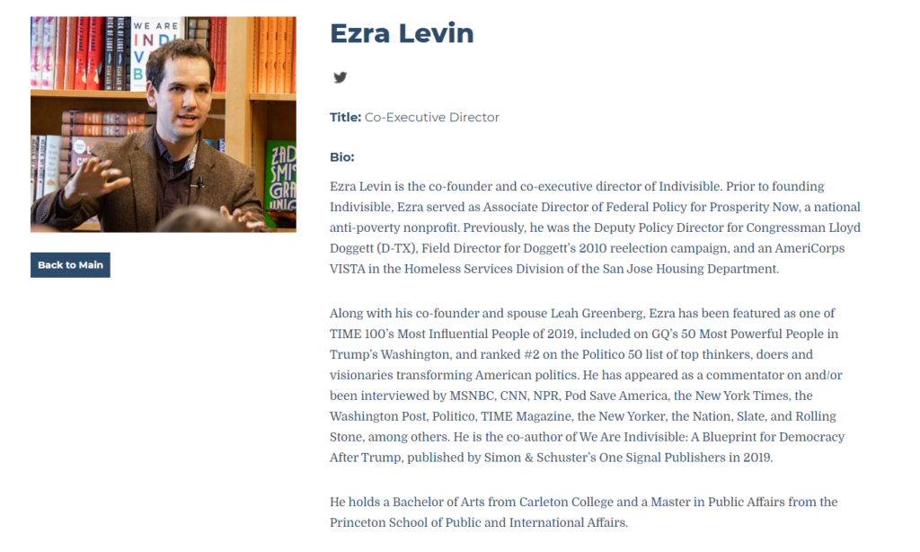 Indivisible is ran by an Executive Leadership team that consists of married couple Leah Greenberg and Ezra Levin. It is a nationwide organization that receives tremendous funding from organizations such as Open Society Foundations, and it also provides funding to its subsidiary chapters, primarily through its state chapters which in turn provide funding to local chapters within each state. The local chapters also do their own local fundraising, whose money are shifted to other groups throughout the state, as I provided an example of earlier.