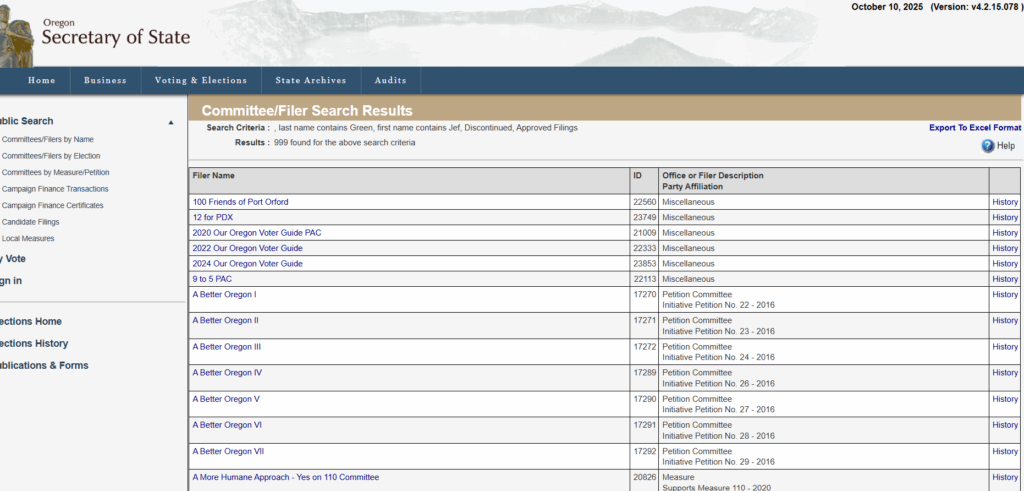 Simply going to the ORESTAR website and searching for his name as treasurer reveals over 999 different PACs that Green has been listed on, all of which at the time of this writing are discontinued committees he has shut down. Further review of the finances of these PACs will also reveal a trend of Green shifting funds from one PAC he controls to another he also controls, as the money accumulated by the collection of PACs he serves as treasurer is often used to fund other Indivisible related PACs after the initial campaign has ended for that particular PAC. This is the main reason for why Green is preferably used as treasurer by the Democrats in Oregon.