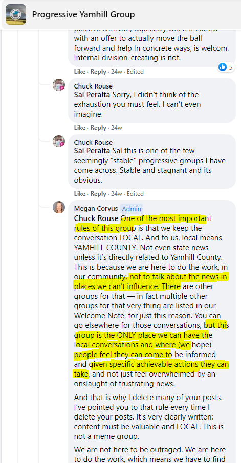 I also provide the following example from the Progressive Yamhill group where leader Megan Corvus chastises another member for posting about things unrelated to their local activism activities assigned to them by central Indivisible leadership,