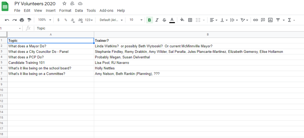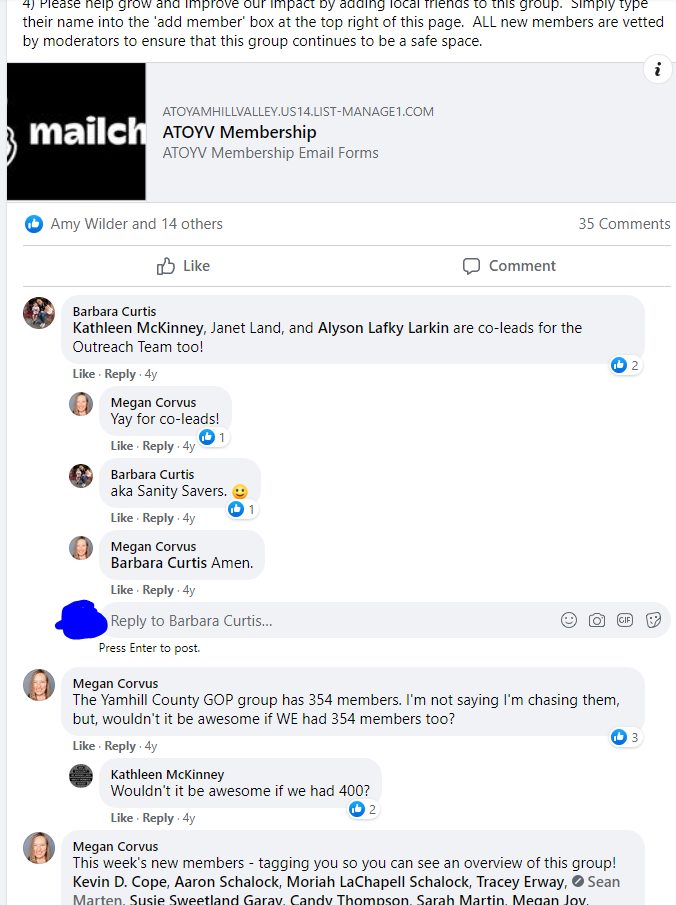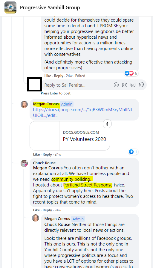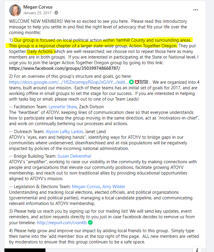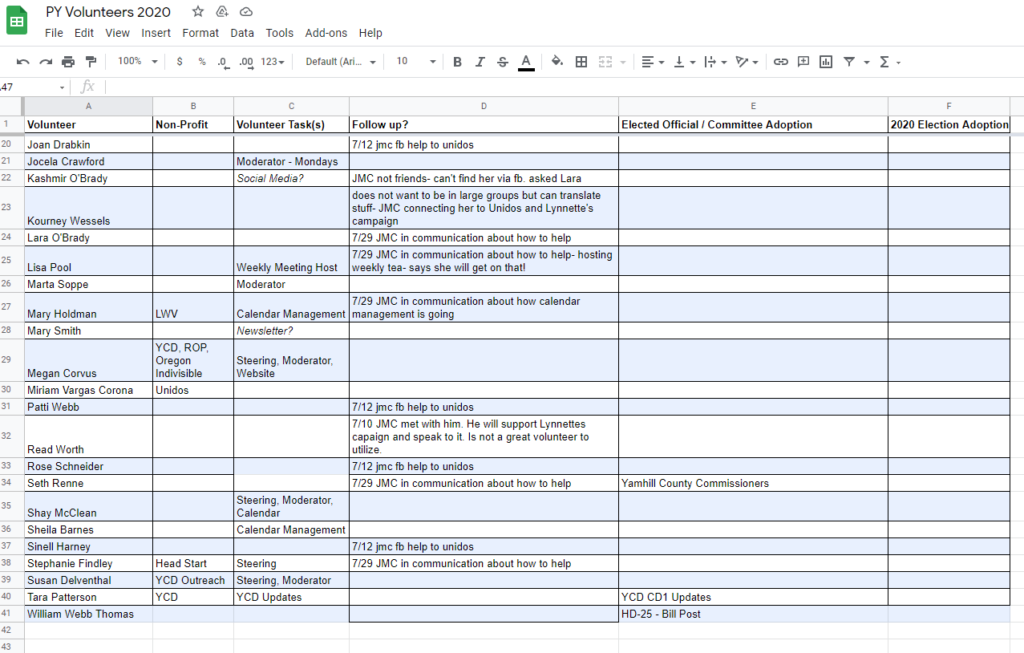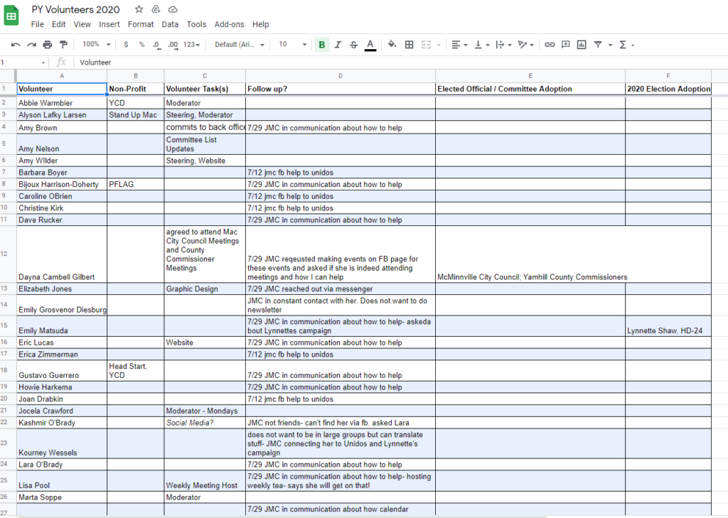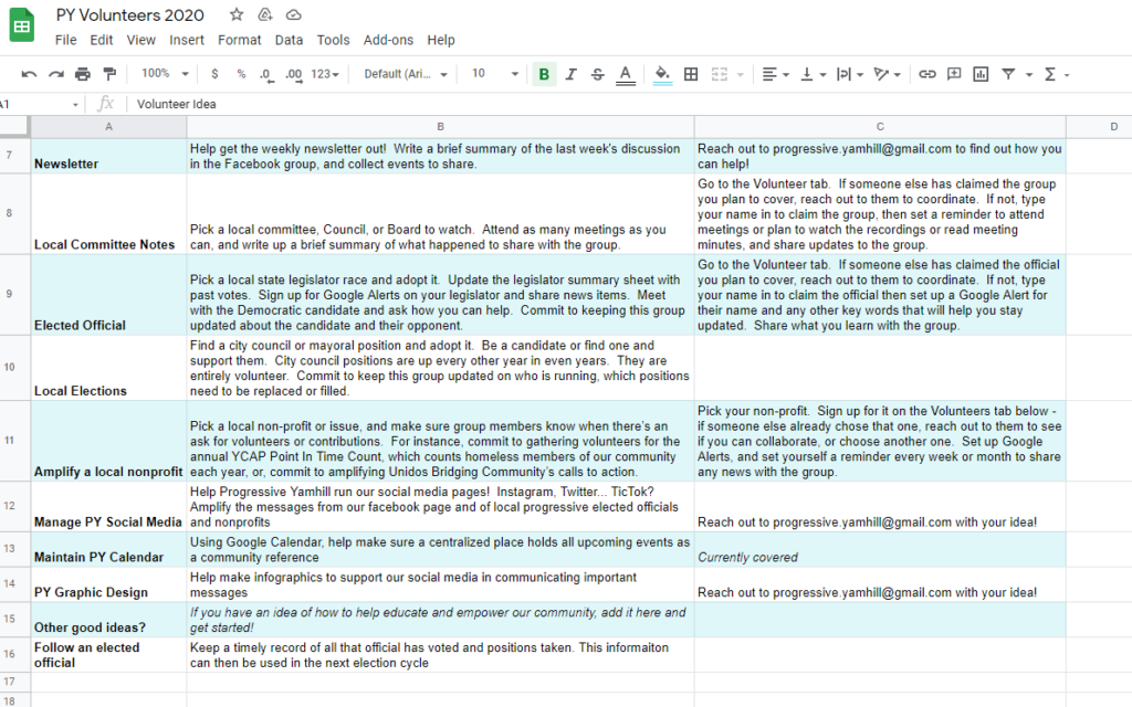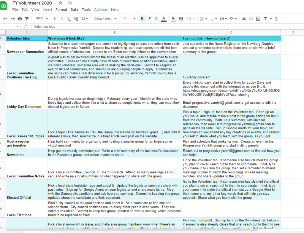 Here is what is in that PY (Progressive Yamhill) Volunteer Sheet Corvus mentioned, by the way, just so you can clearly see that this is absolutely a group that engages in political activism and has clear leadership structure, and is not merely a casual discussion group.