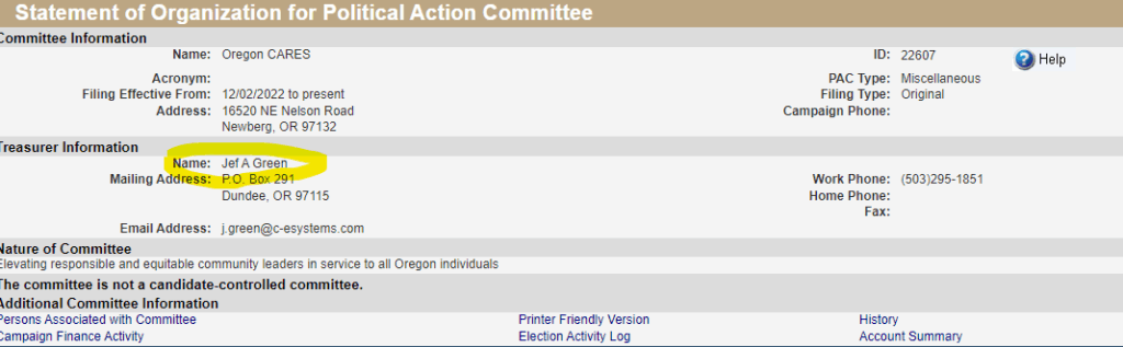 An example of Green serving as treasurer of Oregon CARES, an Indivisible PAC that provides funding to Progressive Yamhill members who run for local elections.